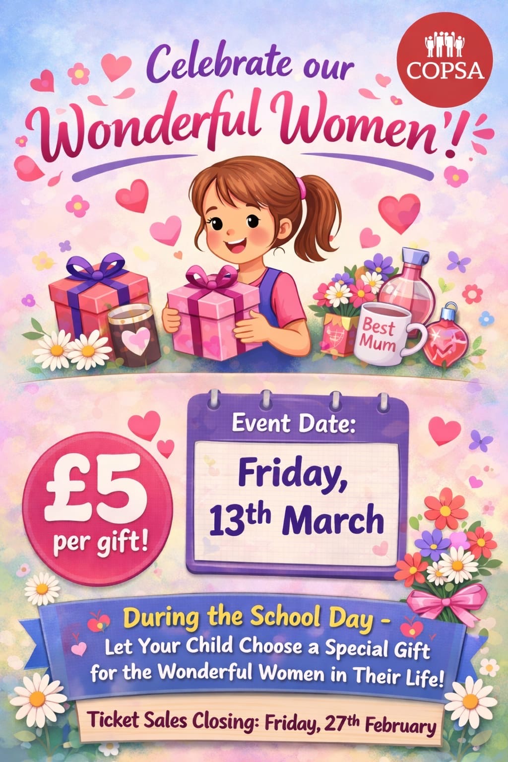 COPSA’s Wonderful Women event is back! The children will have the opportunity to choose a gift for the wonderful women in their lives.