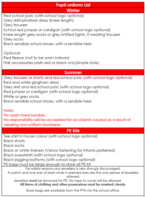- Earrings CANNOT be worn for PE – if your child is unable to remove and replace their own earrings for PE they should not be worn on PE days. Children will not be able to participate in their lesson if they cannot remove their own earrings. No other jewellery should be brought or worn to school.